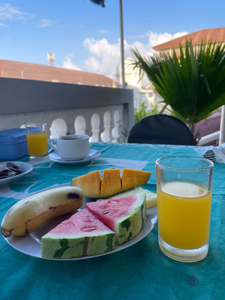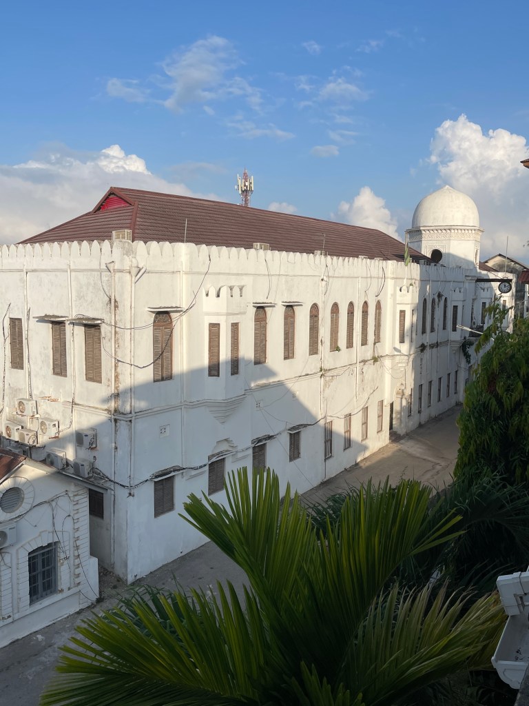 4.3.2023 Dar es Salam-Zanzibar a krásné ubytování v Longe Garden. Sice trochu dražší než všechna předešlá, ale potřebujeme si odpočinout před dlouhou cestou domů. Ze snídaňové terasy máme výhled na justiční palác.