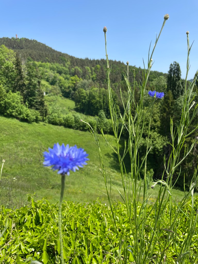 28.5.2023 Orbey-jsme v podhůří nějakých kopečků /já fakt nemůžu najít, jak se to pohoří jmenuje/ a tak co dělat jiného, než jít na túru. Jdeme na rozhlednu, kolem jsou lesy plné borůvčí, níže rozkvetlé louky, takže idylka 😀