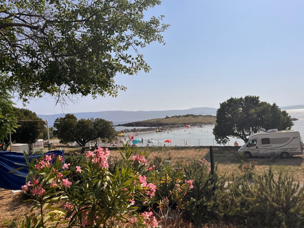 16.6.2025 Byl to blbý nápad, že Slovinsko a Chorvatsko projedeme mimo dálnice. Navigace si asi myslela, že chceme velké “dobrodrůžo”, tak nás vedla “cestou necestou, polem nepolem”, silnice občas připomínala turistickou cestu v horách. Fakt jsme si oddechli, když jsme sjeli k moři a místo do cíle na ostrov Pag, jsme zajeli do prvního kempu, který se vyskytl.
