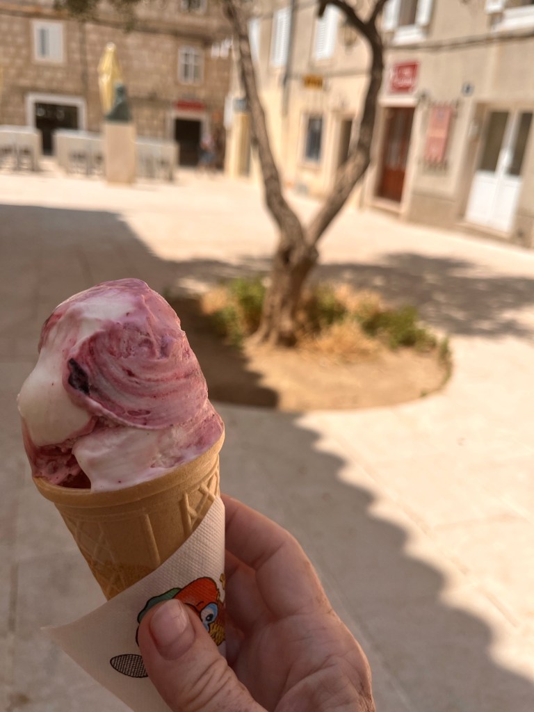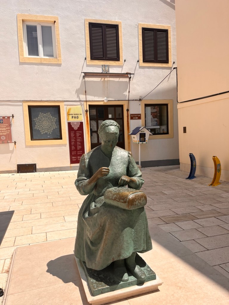 21.6. Přejíždíme na ostrov Pag, kde bychom měli strávit zbytek naší dovolené. Zastavujeme v městě Pag. Tedy nejdříve urputně hledáme místo na zaparkování, povede se až v přístavu. Pak zase urputně hledám, kdo by mi rozměnil 5€, protože automat nevrací a nám stačí 2€ na 2 hod. Když se vše povede, ještě hledám wc /zatím Google mapy vždy poradily/. Záchod je na turniket za 1€, ale někdo tam šprajcnul dvacetník. Ondra se ho snaží vydolovat, abych si mohla zaplatit. Než se mu to povede, podlezu turniket a hotovo. Ušetřila jsem éčko a on posléze vydoloval dvacetník-tolik radosti😀