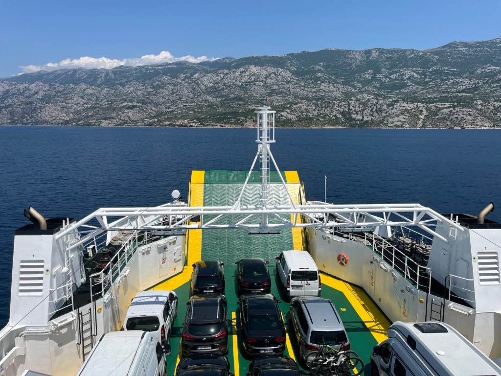 Opouštíme ostrov Pag trajektem. Vždycky mám z nalodění a vylodění trochu trauma, jestli se trefíme!
