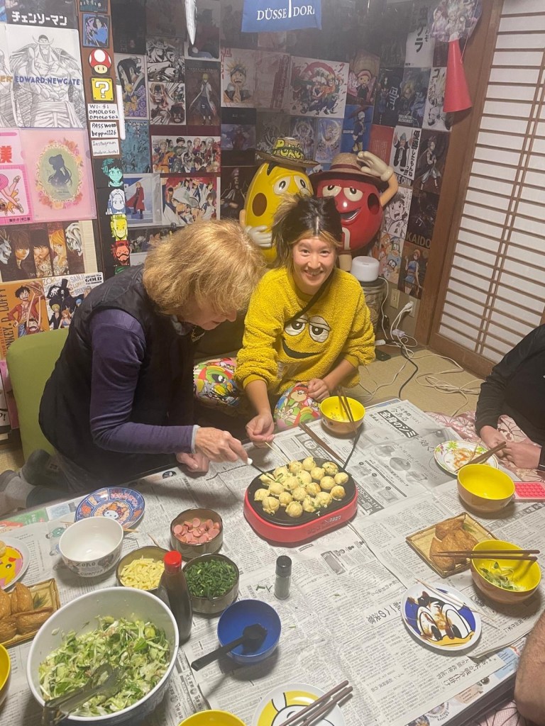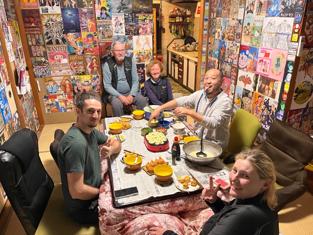 Večer se sešli dva Češi, Australanka, Francouz a dva Japonci na společné večeři, kterou připravili japonští majitelé ubytování – díky Toši!