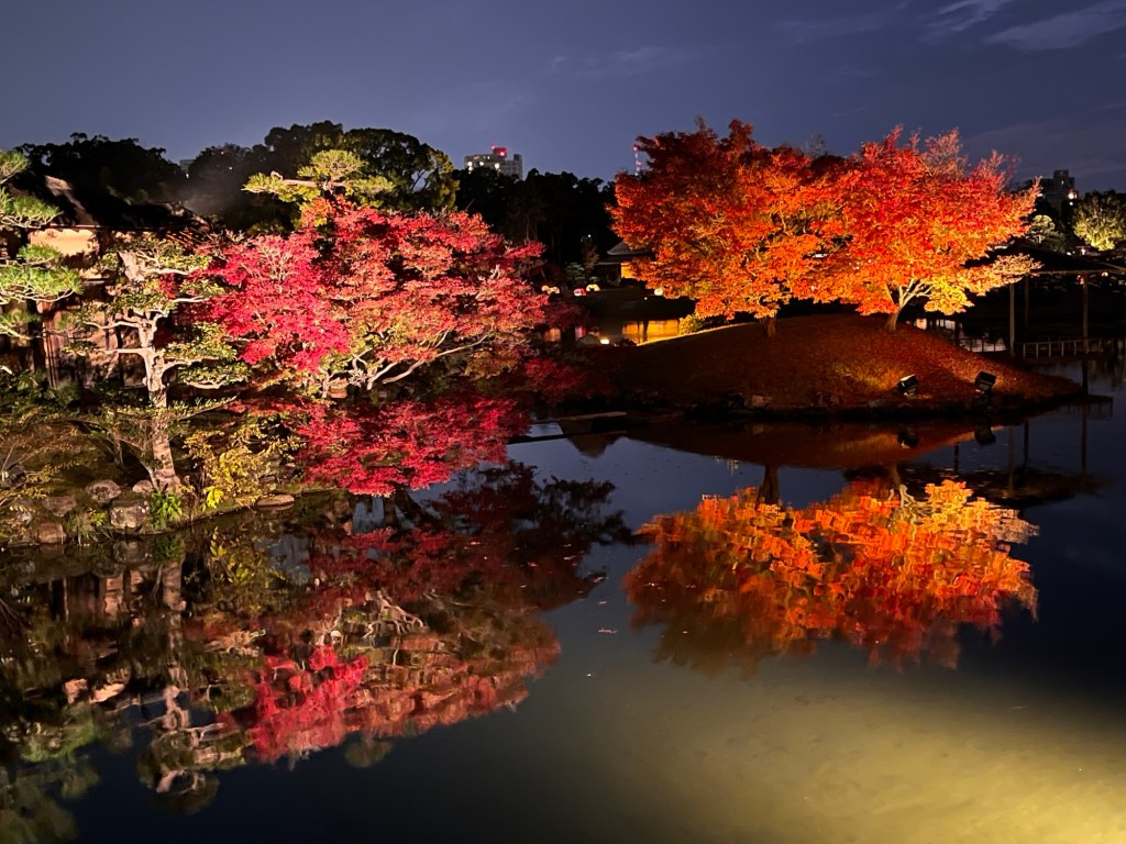 17.11.25 dnes je sváteční den. Nejenže v ČR je to svátek dost významný, protože jinak bych asi momentálně nebyla v Japonsku, ale také se 17.11.24 narodil náš vnuk Toníček a dnes slaví své první narozeniny. 😍 No ale cestovatelské boty svátek nesvátek určují další cestu. Jedeme do Okajamy. Večer navštěvujeme zahradu, která je celá nasvícená. Místy je to krásné, místy na hranici kýče.
