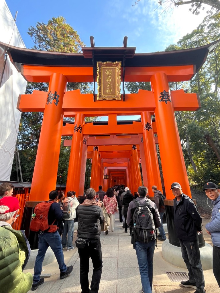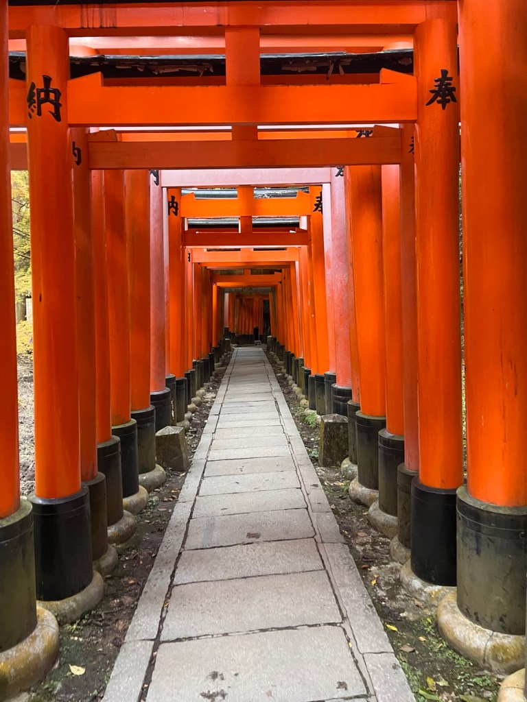 „1000 torii v Kjótu“ obvykle označuje slavné červené brány Fushimi Inari Taisha, které tvoří dlouhé tunely vedoucí až na horu Inari.