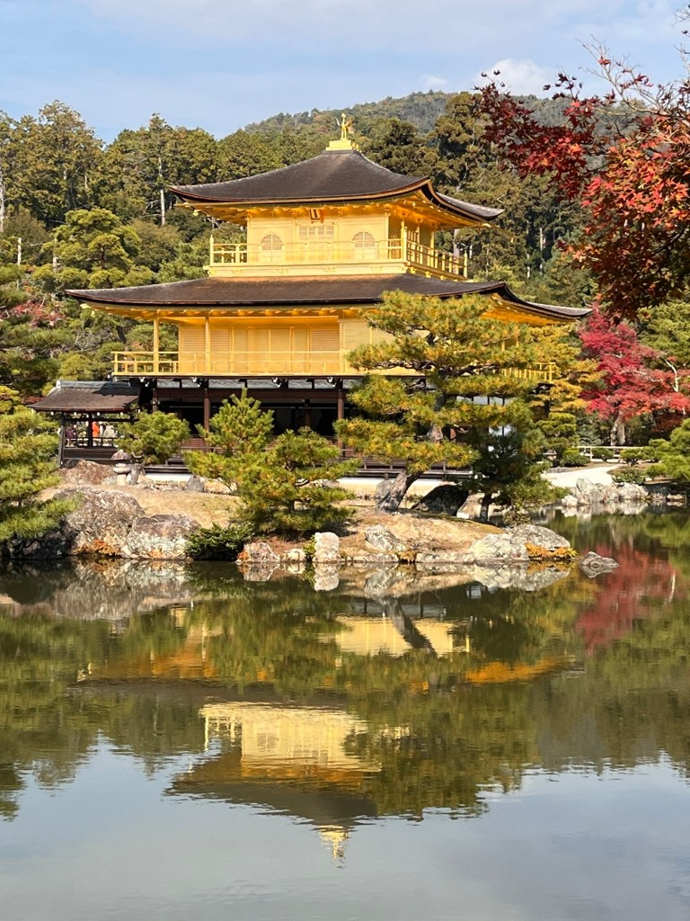 21.11.25 Kinkakujicho 金閣寺町 zlatý chrám s krásným odleskem ve vodě a nádherně podzimně zbarvenou zahradou.