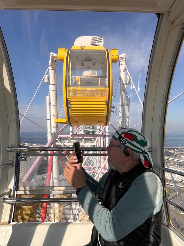 24.11.25 z centra Ósaky se posouváme k letišti. Pro mě je to balzám na duši. Žádné davy, mačkanice, dezorientace. Jdeme na procházku k moři a z dálky vidíme “to kolo”, nevím, jak se tomu říká dnes, za mých mladých let to bylo ruské kolo. No a Ondra má ten nápad, že se svezeme. Já podobné atrakce moc nemusím, ale když mu to udělá radost!
